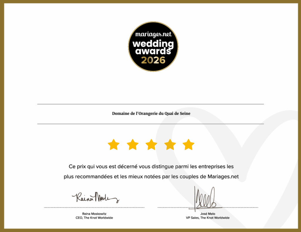 Domaine de l’Orangerie du quai de Seine, entreprise de mariage reconnue comme l’une des meilleures de France, est lauréate des Wedding Awards 2026
